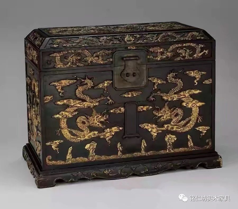紫檀五爪金龍箱,長(zhǎng)63厘米,寬33.5厘米,高47.6厘米。蓋與箱沿邊施闊皮條線,鏟地高浮雕雙龍戲珠紋,間布朵云紋,下部雕海水江崖紋。底座壺門式輪廊,上刻卷草紋。所有高浮雕紋飾上皆描金,在檀木的襯托下,更絕醒目、華麗。