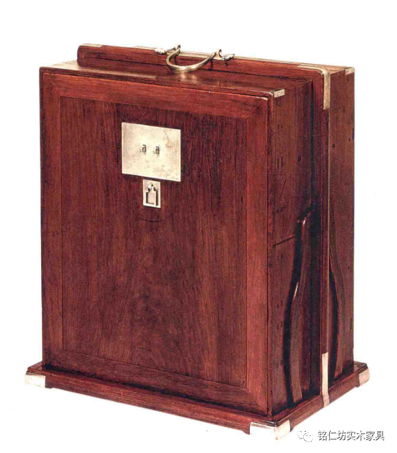 黃花梨插門式扛箱,此箱碩大,長(zhǎng)78.8厘米,寬45.5厘米,高84厘米。看其選料之精,兩開門整板對(duì)開,紋理對(duì)稱,提梁線條優(yōu)美,更不在中間留空當(dāng)穿杠,使其無(wú)法被扛抬,銅飾件臥槽平鑲,施工精細(xì),造型勁挺。就得知這類黃花梨實(shí)例是取扛箱造型而成的室內(nèi)家具,而非實(shí)用扛箱。他們的用途應(yīng)是存放書卷、文具及貴重物品。而大家多年稱他們?yōu)樘嵯洹⑿泄竦鹊仁清e(cuò)誤的,現(xiàn)不妨正其名為“扛箱式柜。”
