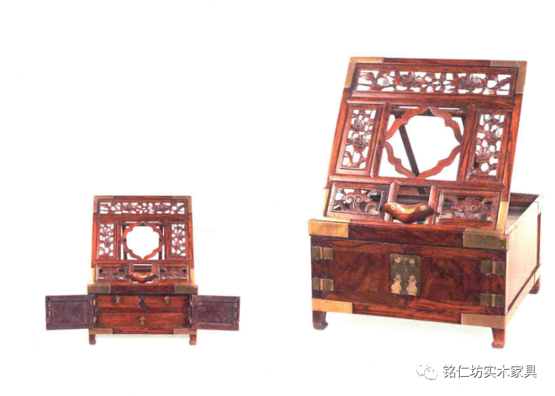 黃花梨折疊式鏡臺(tái),是由鏡架發(fā)展而來的家具。架下增添了臺(tái)座,兩開門及內(nèi)設(shè)抽屜。鏡架框內(nèi)三邊嵌裝透雕花紋的絳環(huán)板,正中方格安角牙,下層設(shè)荷葉式托子,可上下移動(dòng)。